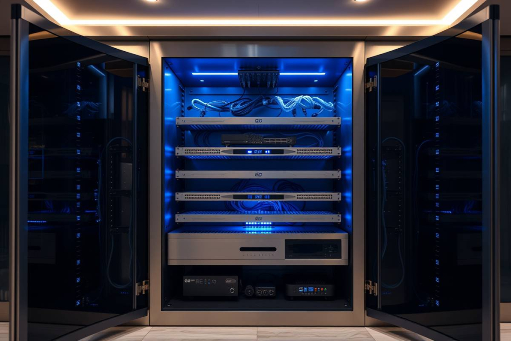 Professional PowerSol smart 5G network cabinet in a modern Toronto home featuring blue LED lighting and high-tech equipment.