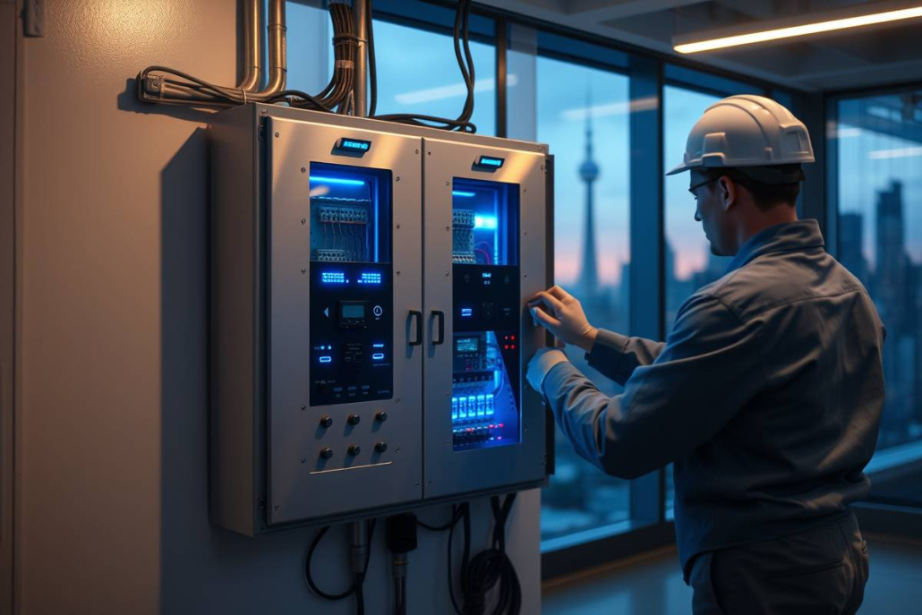 PowerSol smart electrical panel with blue LEDs installed in Toronto commercial building